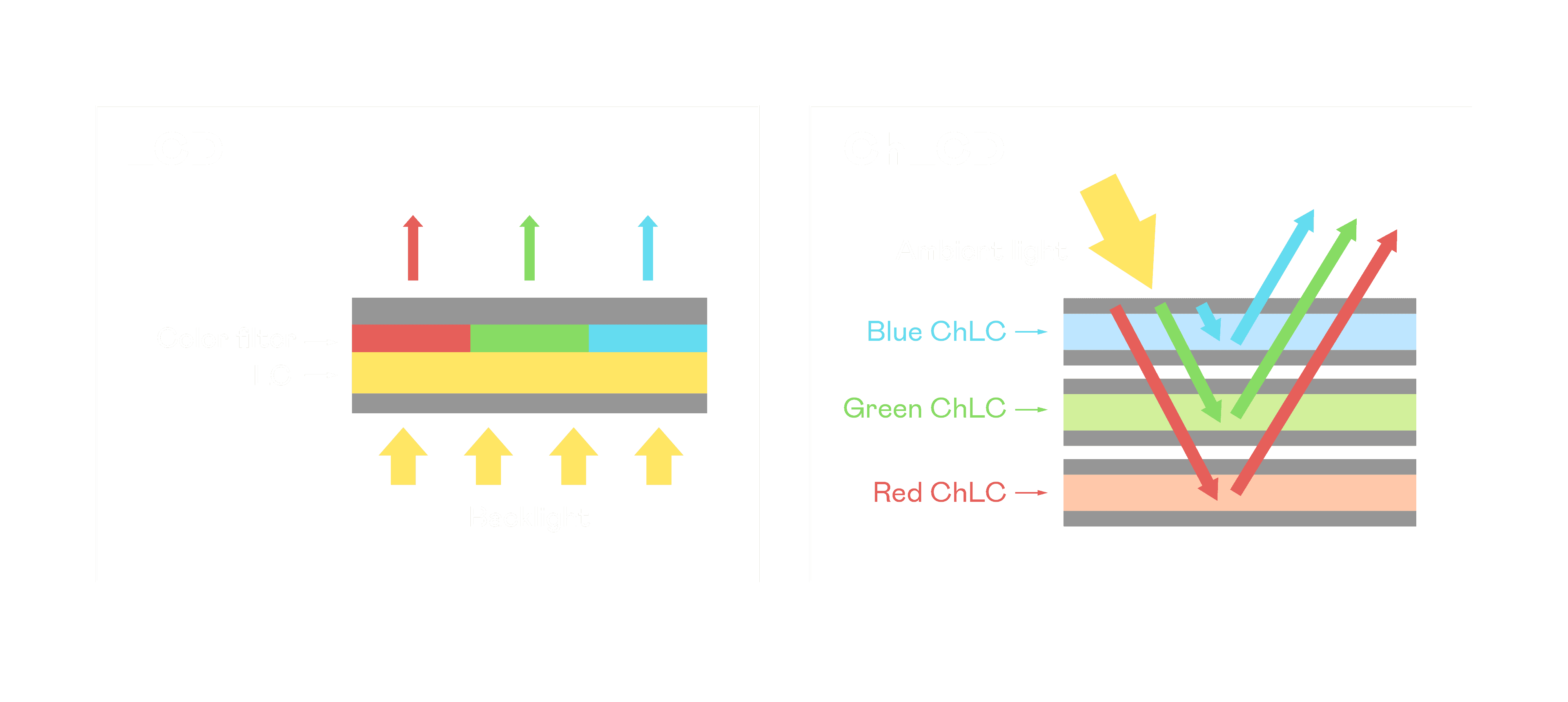 开云电子胆固醇液晶显示器是由红、、绿、、、、蓝三层胆固醇液晶面板堆叠而成,,,,并采用无彩色滤光片设计,,,,减少环境光在反射过程中的损耗。。